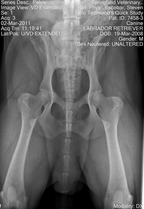 UPDATE: I resubmitted Albert's hips to OFA in November 2013 (at 5 1/2 years of age) and they came back rated "good". At the same time, I did Penn Hip; that came back in the 90th percentile with a .27 and .31! So I'm finally satisfied. _______________________________________________________________________________________________________ 3/14/13 Albert's current hip rating of "fair" is not an accurate rating. Even Dr. Keller, head of OFA, said "they should at least be a good". At about 14 months of age, I had prelims done by a very experienced repro specialist, Dr. Morris Link, Madison, WI; prelims rated "excellent". At 29 months, as I was frantically trying to get ready for my relocation to Virginia, a friend took Albert to another vet (that I won't mention) for his final OFA x-rays. She did not see the film, nor did we get a picture or digital. I was shocked when that came back from OFA rated "Borderline", with "slight subluxation of the left hip"; they recommended to do again in 6 months. Elbows passed. After moving to Virginia, I had my repro vet re-do Albert's hips at 35 months of age (under anesthesia). He also looked at the picture of the 14-month prelims that I had. His opinion was that Albert's hips were virtually identical in the 14-month and the 35-month x-rays ... there had been NO changes. He felt that we had a strong good, possibility of an excellent. These last x-rays came back from OFA rated "fair". I talked with Dr. Keller, who was very open. He said he had seen the x-rays as soon as they came in, and that "they should at least be a good". Before I could challenge him further, he explained that the other two orthopedic specialists had access to the previous rating and "probably were afraid to take too big a jump" from the previous "borderline" rating. Dr. Keller told me I should wait 6 months until the other two specialists were off the cycle, then re-submit the hips. That would be the 4th time I've had to pay for hip x-rays and submission fees, just to get an accurate rating!!! I am upset to have gotten caught in OFA's issues. First, they need to start sending back x-rays, refusing to rate them, if the positioning is not correct. They used to do this years ago but rarely do anymore, apparently don't want to offend the veterinarians who took the x-rays. Second, the orthopedic specialists at OFA should NOT have access to previous ratings or film, that obviously can and does influence them. Their rating should be based solely on the film that was submitted to them for evaluation ... that is what they are paid to do. I may re-do Albert's hips but, at present, cannot afford to pay for a fourth attempt. So, I'm offering this explanation and a pretty good picture of Albert's most recent hip x-ray, taken at 35 months of age. Although I fully realize that a "fair" IS a pass on hips, in this case it is not a correct representation. I also want to point out that in the first 3 generations behind Albert, out of 14 dogs, there are 4 excellents (including his mama) and 10 goods. Out of Albert's littermates that have had hips done, there are several excellents, the rest good. None of his littermates have any evidence of hip problems. ![]() |
