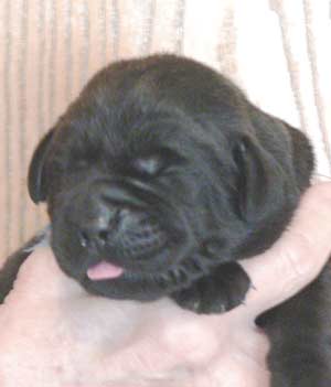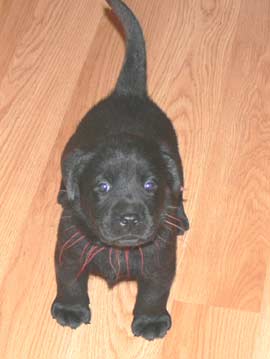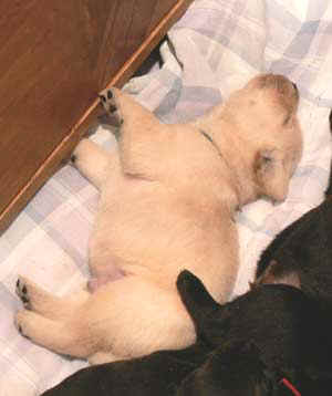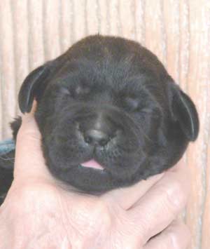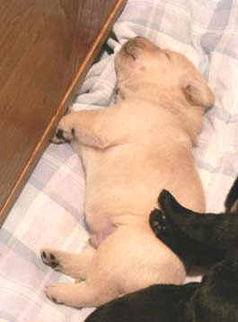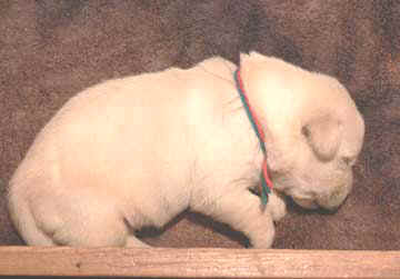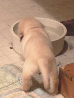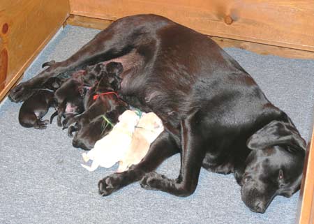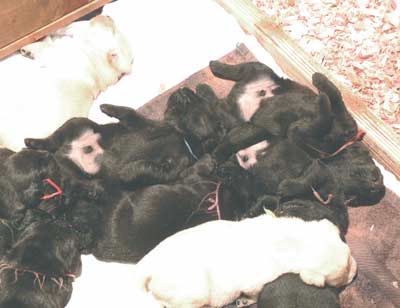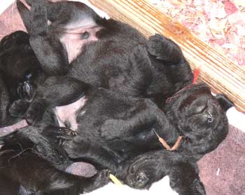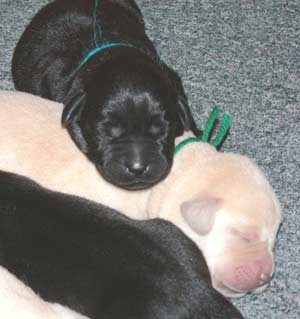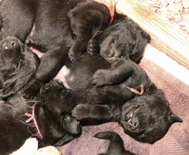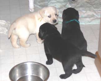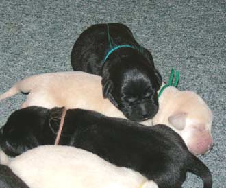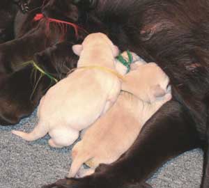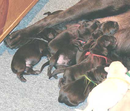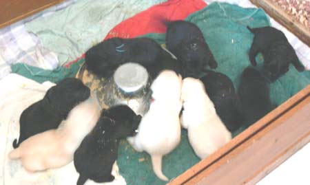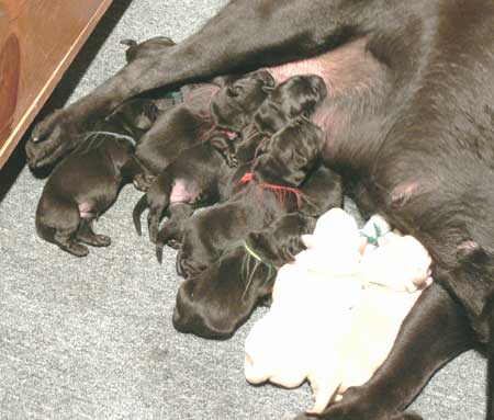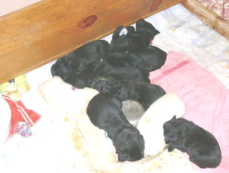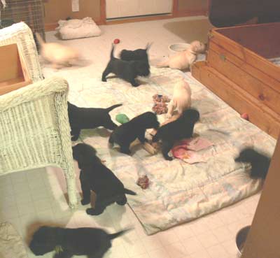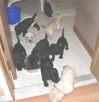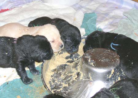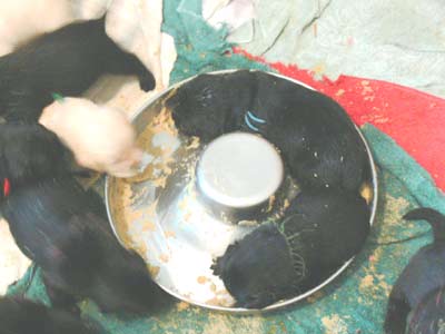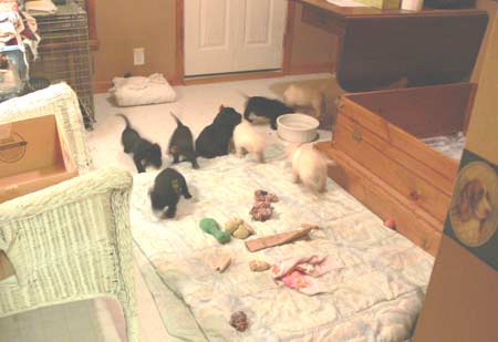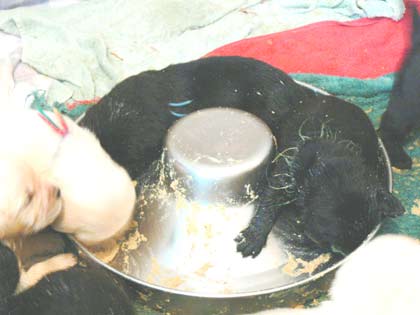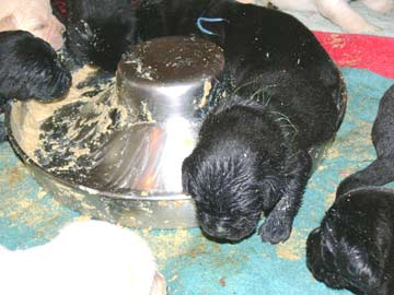 Because we have SO many puppies, I started feeding the puppies at 2 1/2 weeks (as soon as I thought they could eat out of a pan) instead of the normal 3 weeks. I also have been bottle feeding some of the smaller puppies twice a day since birth to be sure they're getting enough. They're weighed every 24 hours, calculating their weight gain as a % of their original birth weight. All are doing fine and now, by 4 weeks, I no longer have to bottle feed anyone ... the smaller ones are very aggressive eaters and catching up! By 3 1/2 weeks, 11 puppies no longer fit around one large flying saucer feeding pan, so I have to divide them into 2 separate pans and monitor that all get a place at "the table". And, as you may imagine, it's MUCH more work to keep the whelping box reasonably clean with the equivalent of 2 litters in there. And 198 nails to clip every week to 10 days!