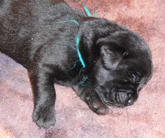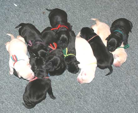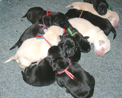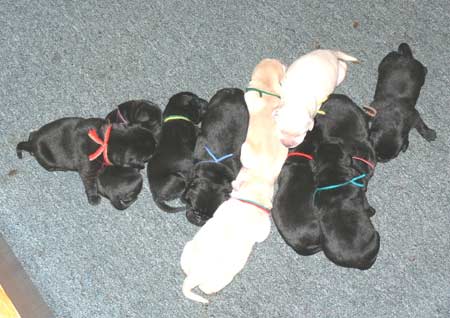 Puppies at 4 days (clockwise) Red/Brown Boy, Purple Girl, Green/Yellow Boy, Blue Boy, Green Boy, Yellow Girl, Brown Boy, Peach Girl (underneath), Turquoise Girl, Red Boy & Red/Turquoise Boy