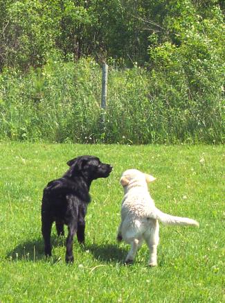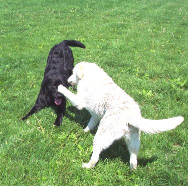 has fun with the 6-month-old puppies, Clarice (left), with Gizmo (right)