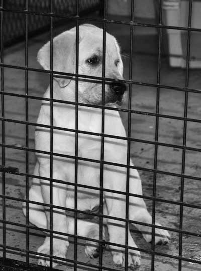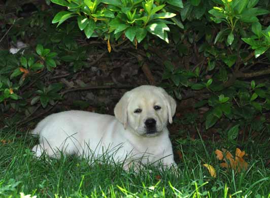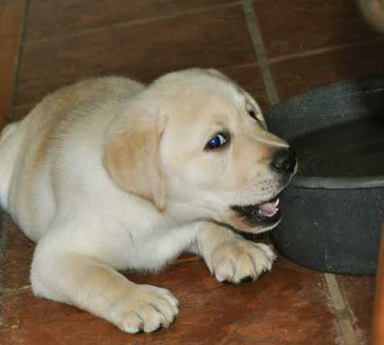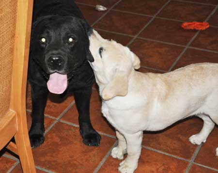 15 weeks: At left, chewing on Elmer's ear, naughty girl!