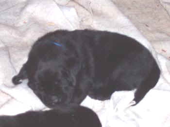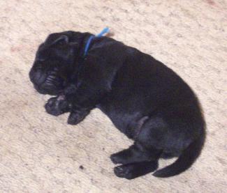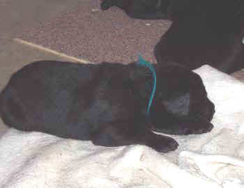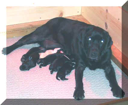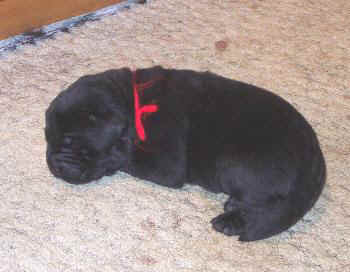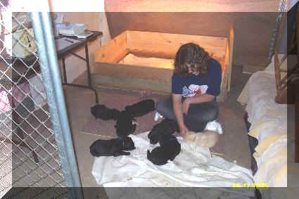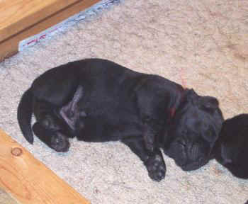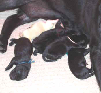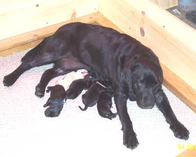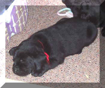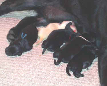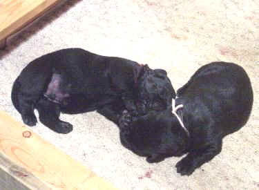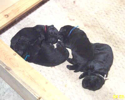 Puppies @ 4 weeks ... crashing after playing with Mary Note that there are more than the 4 surviving puppies Chase had. She took on 3 of Karina's puppies after Karina developed mastitis ... just as if they were her own babies. What a good mama she is!!!
