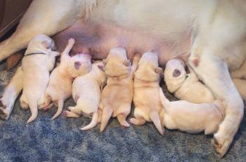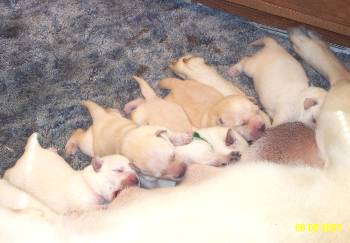 Summer & puppies (left to right) - Day 1 Lavender Girl, Red Boy, Green Boy, Peach Girl, Brown Boy, Pink Girl, Blue Boy
