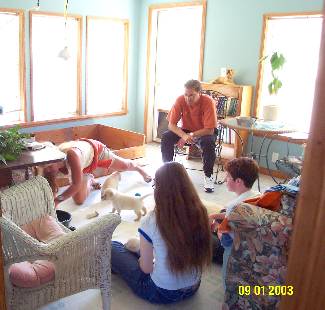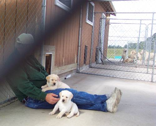 Puppies relaxing with Scott Thiermann @ 6 weeks (big boys & Valerie in background)
