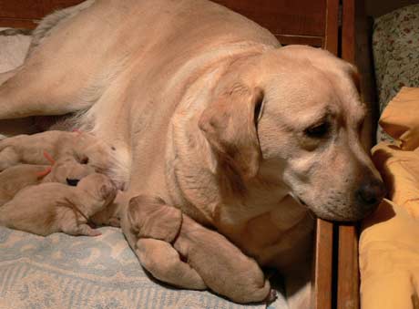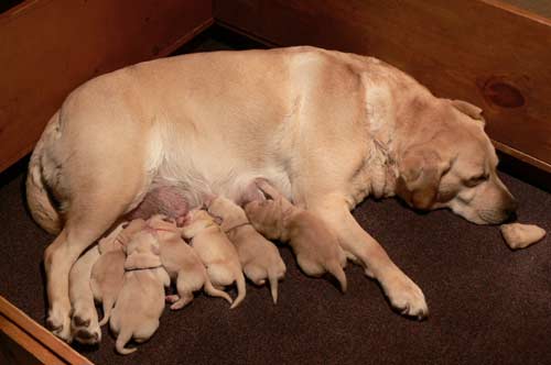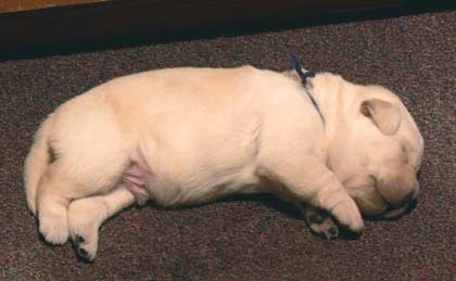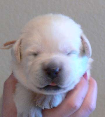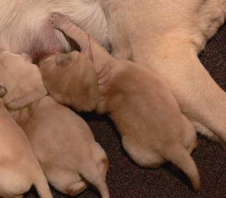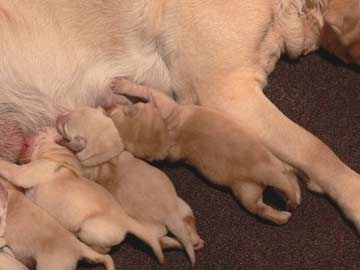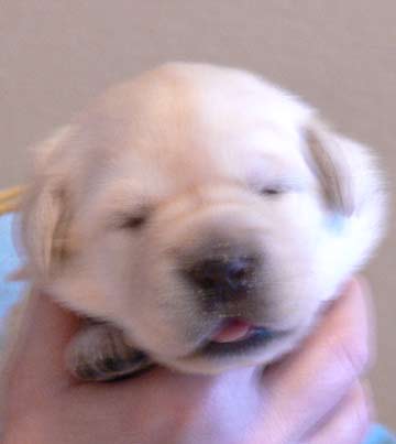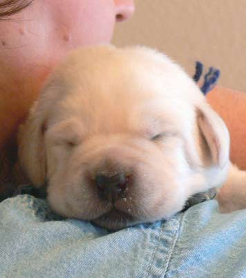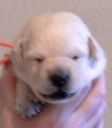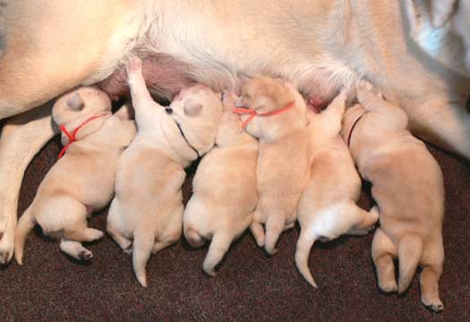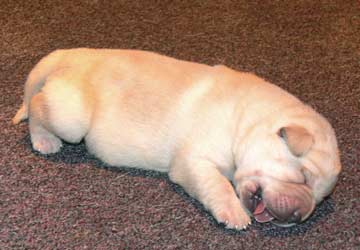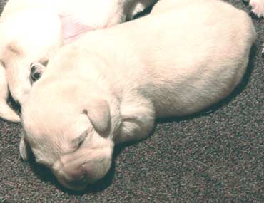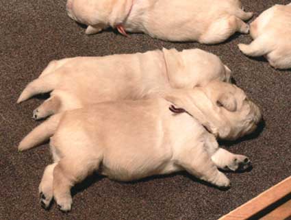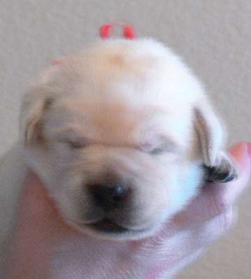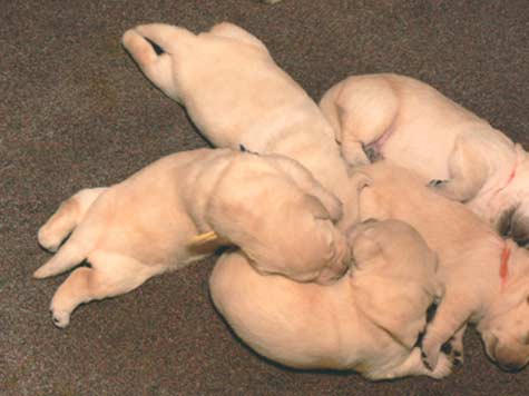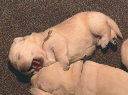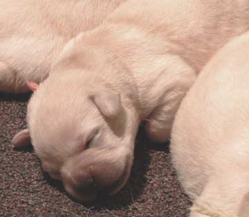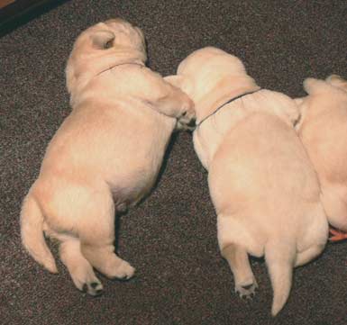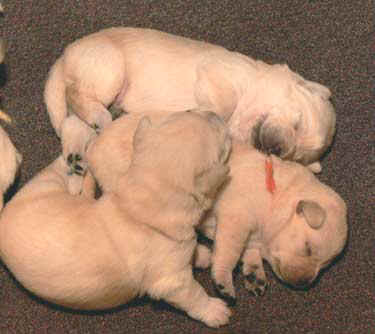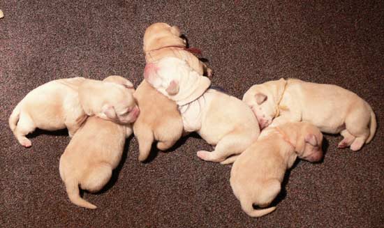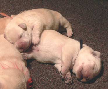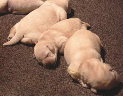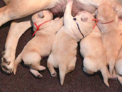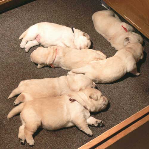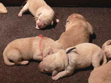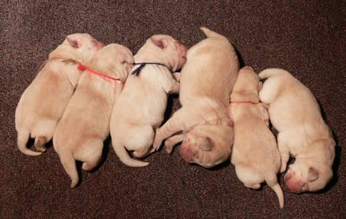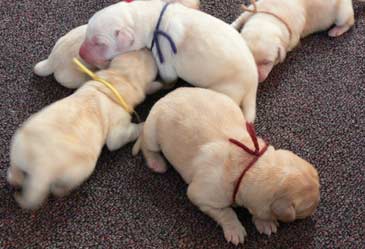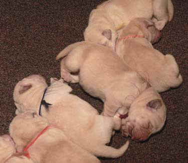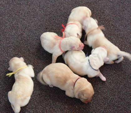 Puppies at 13 days (front to back): Burgundy Boy, Brown Boy, Peach Girl, Navy Boy (on right) Yellow Girl & Red Boy