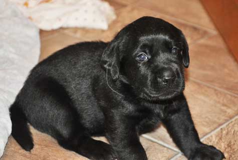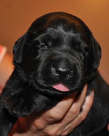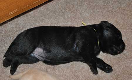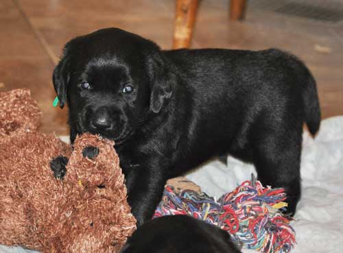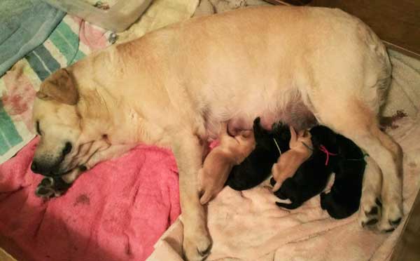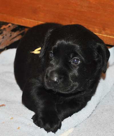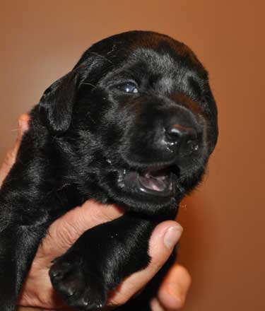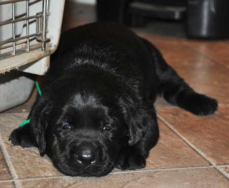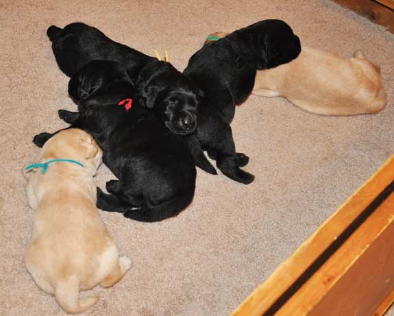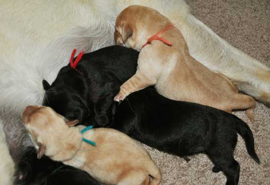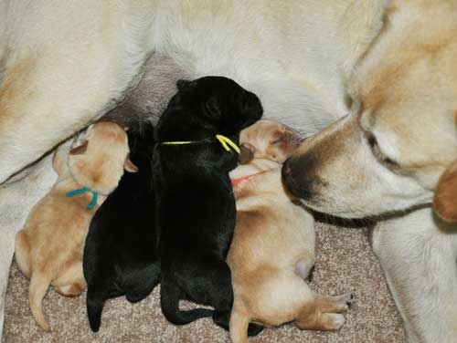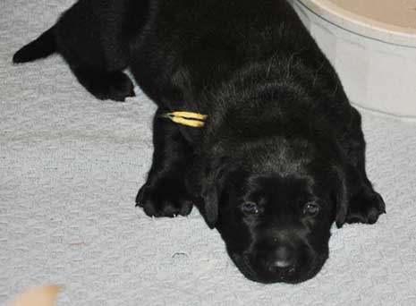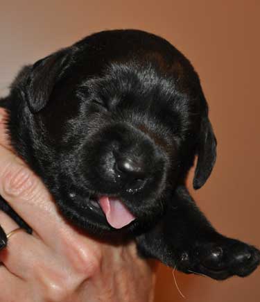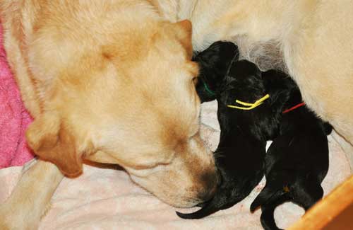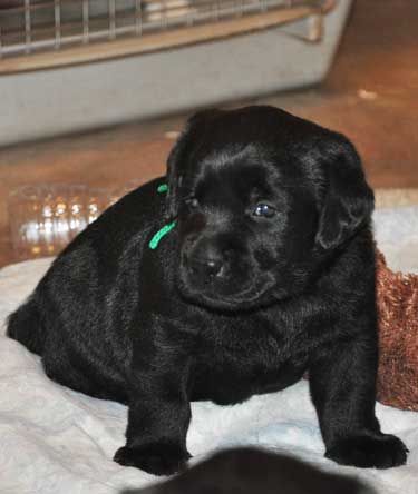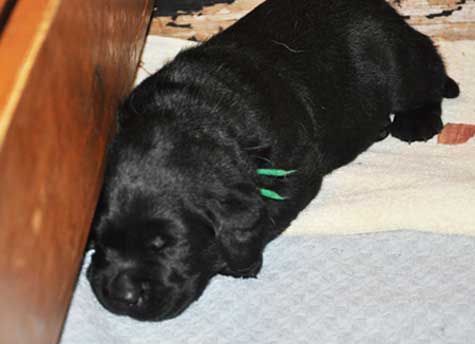 Addie with the black puppies on Day 2: Green Boy, Yellow