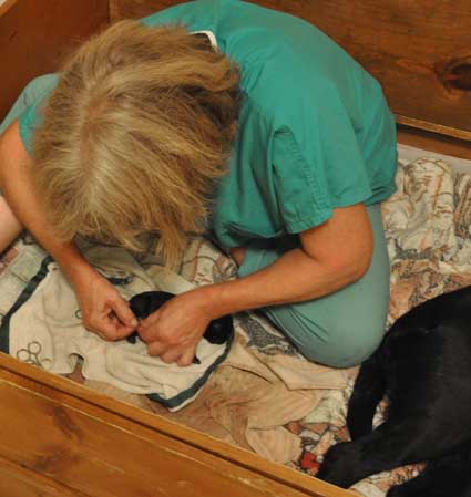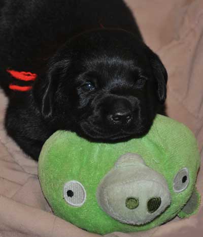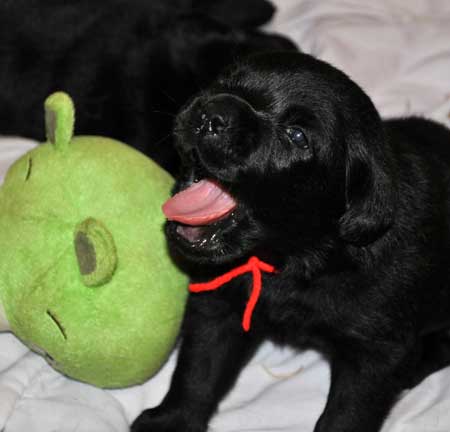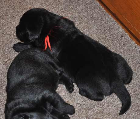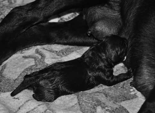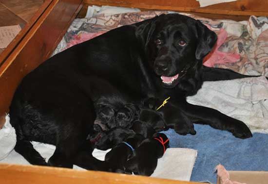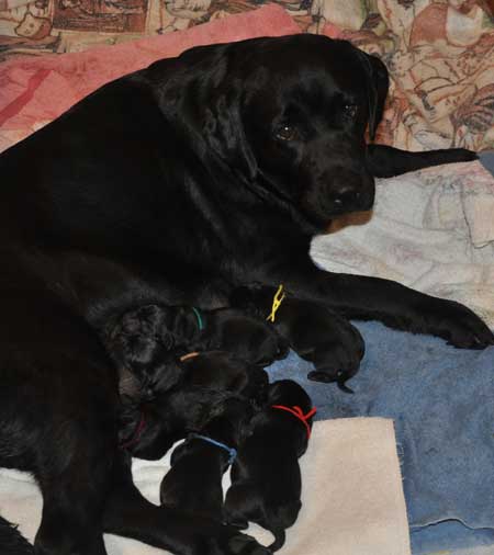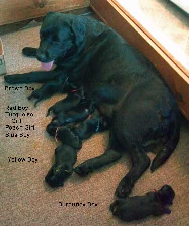 (left) Berry with her first 2 puppies, Red Boy & Turquoise Girl - (right) Jenny
