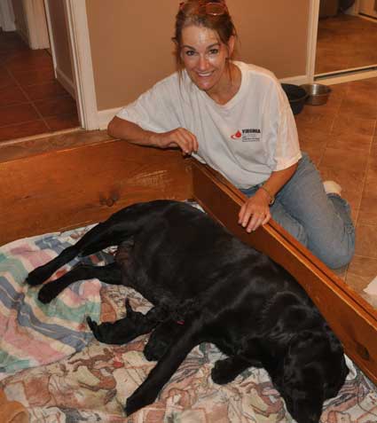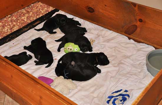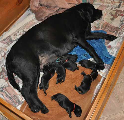 (left) Berry with the first 6 puppies - (right) Berry with all 7 puppies