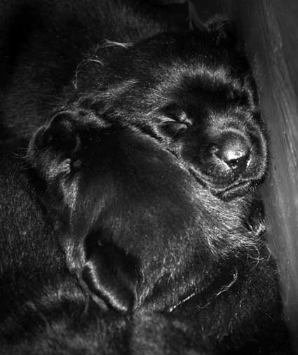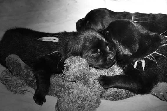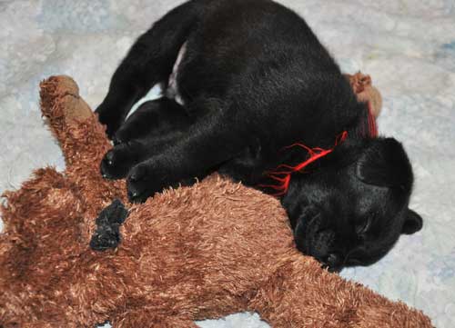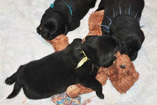 Yellow Boy at 3.5 weeks, snoozing with the bear and 2 other puppies