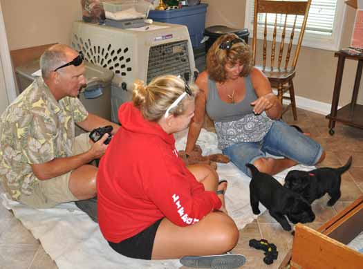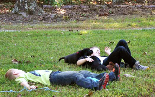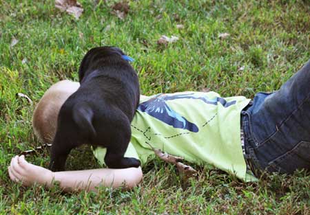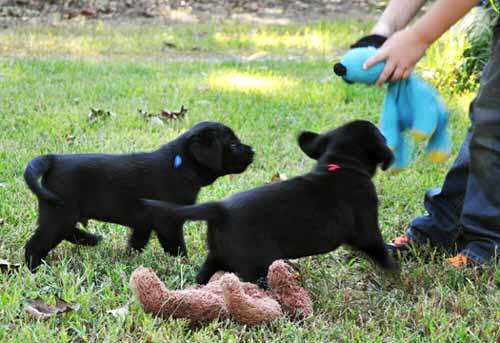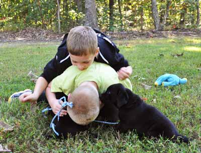 The puppies had a wonderful time playing in the yard with the neighbor boys,