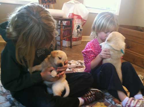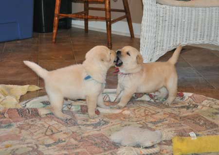 Puppies enjoying a visit with neighbors, Maddox & Bennett Pleasants (5 weeks)