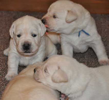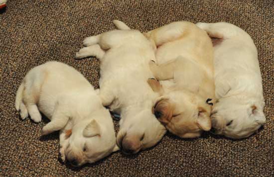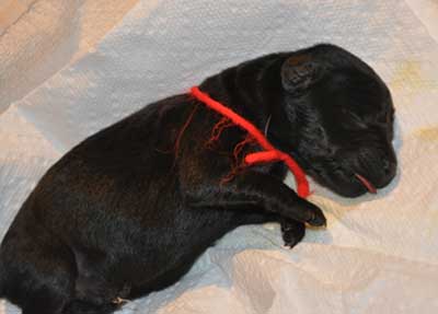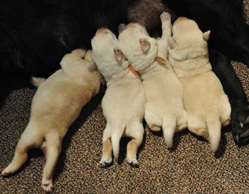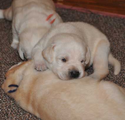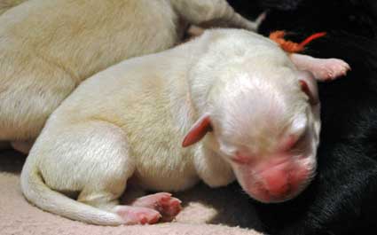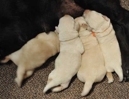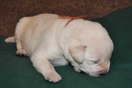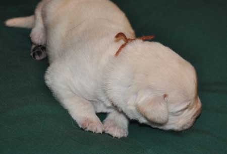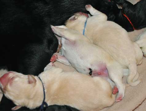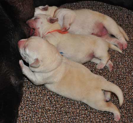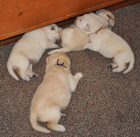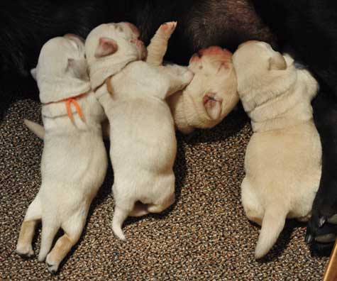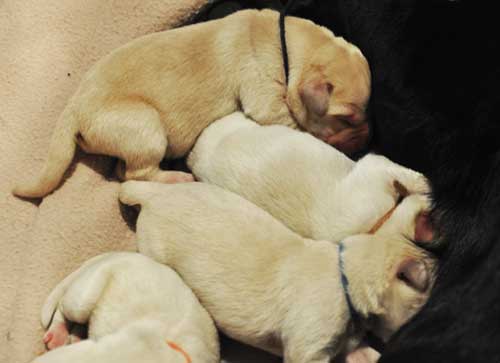 Puppies at 7 days (Navy, Peach, Brown & Blue, left to right)