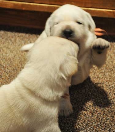 2.5 weeks: (left) Brown Boy having fun - (right) Peach Girl, Blue Boy & Brown
