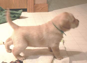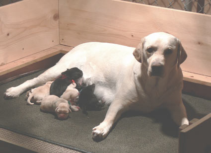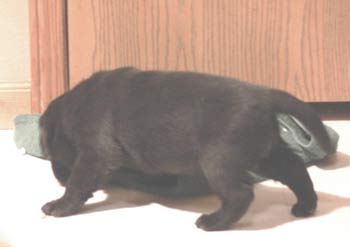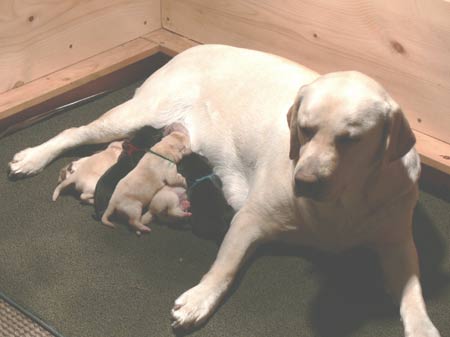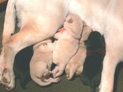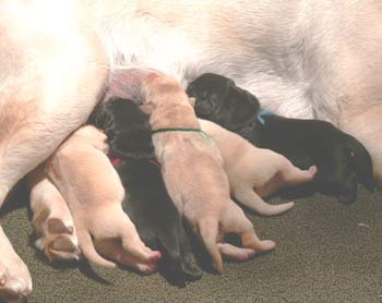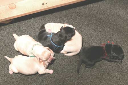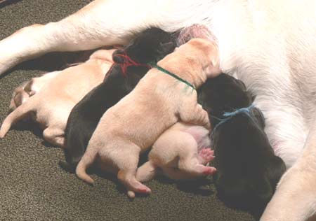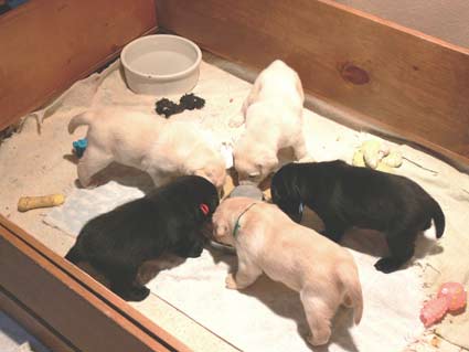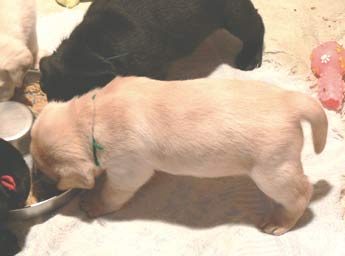 Puppies eating at 4.5 weeks (clockwise) Red Boy, Brown Boy, Peach Girl, Blue Boy, Green Boy