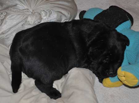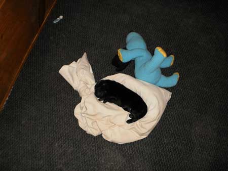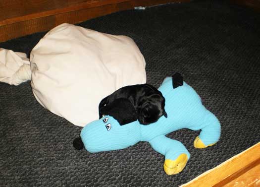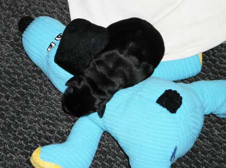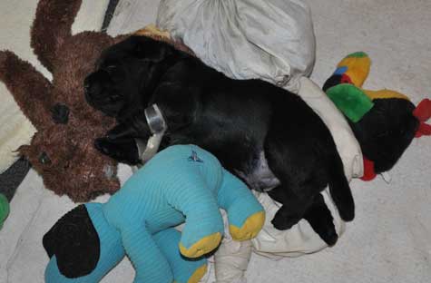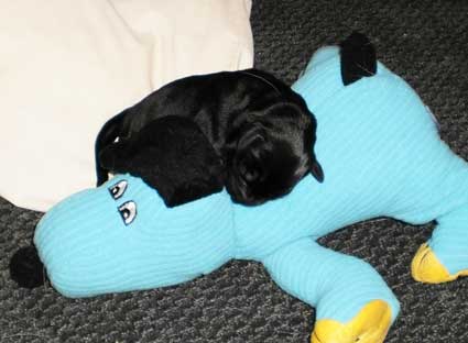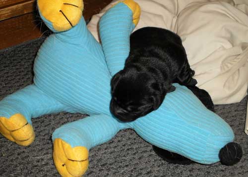 He has lots of toys to snuggle with and gets lots of attention and handling.