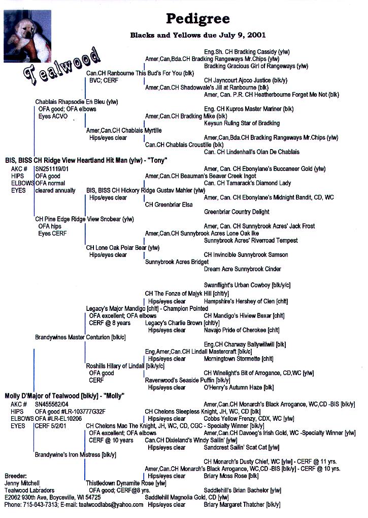 Pedigree for the Molly & Tony Litter due July 9, 2001