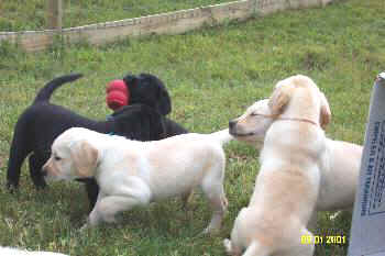 Blue/Green Boy - 9 weeks Pups playing in yard at 8 weeks